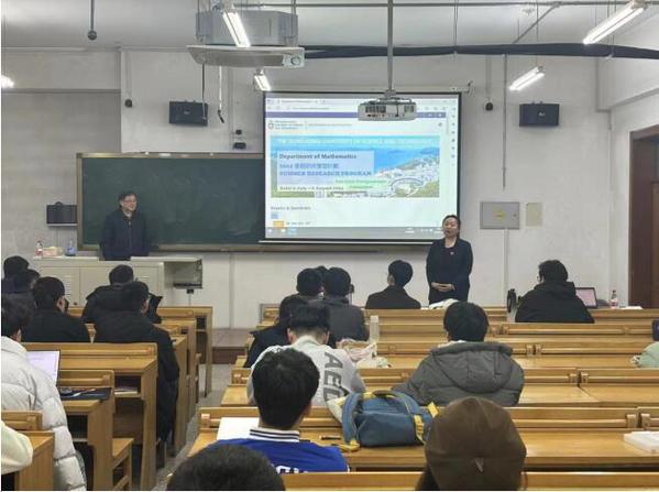 活动邀请到香港科技大学数学系教授项阳和数学系助理教授彭志超。项阳教授首先介绍了香港科技大学数学系的基本情况、研究方向和研究成果,让同学们深入了解到数学领域前沿进展;随后,项教授对香港科技大学数学系的招生信息、暑假学校信息、各类奖学金以及往届哈工大学生进入香港科技大学数学系就读的情况进行了详细讲解。在交流中,项教授还介绍了今年香港科技大学数学系毕业生的去向,展示了该系学生的就业前景和发展潜力。最后,针对同学们提出的申报要求、英语成绩要求等事宜给予了详细解答,为同学们提供了实用的申请建议和指导。本期讲座由史宁老师主持,来自我校各学院(部)师生近50人参加了此次活动。