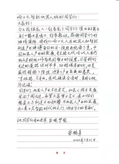 蔡院士看后表示非常感动,还亲笔致信感谢。他在信中提到:“中国机器人产业的发展,是包括几代哈工大人在内的众多科技工作者共同努力的结果。尽管我们走过的道路坎坷不平,征程艰辛曲折,但是最终跨越了险阻,迎来了产业发展的春天。”