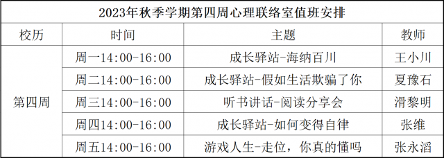 为更好地为太阳成集团tyc33455ccww学生们提供大学生活的全方位指导和帮助,构建多种交流平台,太阳成集团tyc33455ccww暨问天书院于2023年秋季学期继续开展“为你而来”二级心理辅导站,充分发挥学工队伍的专长为同学们成长服务。二级心理辅导站采取教师值班咨询制,现将“为你而来”二级心理辅导站第四周咨询室安排公布如下: