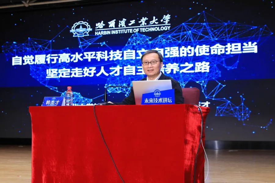“人才是第一资源,我们要胸怀‘两个大局’,着力提升拔尖创新人才的自主培养能力。”韩杰才强调,一流大学必须以持续的一流创新人才培养为使命,以提高人才培养质量为核心,以培养拔尖人才为重点,加快建设世界重要人才中心和科技创新高地。韩杰才从7个方面为同学们介绍了我校提升人才自主培养能力的思路与举措:一是优化人才培养结构布局,强化基础、重视应用、特色培养,优化学科专业结构、人才培养类型结构,加强科教、产教融合协同育人基地建设;二是深化拔尖创新人才选拔改革;三是创新人才培养模式,着力构建2+X多元人才培养体系;四是完善人才使用机制,拓宽毕业生发展路径,加大拔尖创新人才支持力度,优化青年人才发展制度环境;五是健全科学评价制度,科学设立人才培养评价指标、构建多元主体联合评价和拔尖学生长周期评价;六是加强高水平教师队伍建设,强化名师引领作用,完善教师发展与激励机制;七是加大稳定支持力度,强化课程教材建设、加强保障条件建设和多元化经费支持。韩杰才最后强调:“才者,材也,养之贵素,使之贵器。”要充分发挥人才第一资源作用,鼓励年轻人大胆创新、勇于创新,让青年才俊像泉水一样奔涌而出,在哈工大的大平台上写好“大写人生”。报告后,冷劲松向韩杰才赠送“未来技术讲坛”嘉宾纪念牌。学生代表向韩杰才献花。