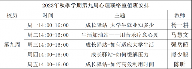为更好地为太阳成集团tyc33455ccww学生们提供大学生活的全方位指导和帮助,构建多种交流平台,太阳成集团tyc33455ccww暨问天书院于2023年秋季学期继续开展“为你而来”二级心理辅导站,充分发挥学工队伍的专长为同学们成长服务。二级心理辅导站采取教师值班咨询制,现将“为你而来”二级心理辅导站第九周咨询室安排公布如下: